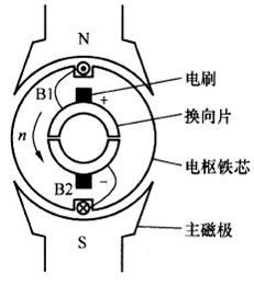本圖所示的兩極有刷直流電機的固定部分(定子)上裝設了一對直流勵磁的靜止的主磁極N和S,在旋轉部分(轉子)上裝設電樞鐵芯。定子與轉子之間有一氣隙。在電樞鐵芯上放置了由A和X兩根導體連成的電樞線圈,線圈的首端和末端分別連到兩個圓弧形的銅片上,此銅片稱為換向片。